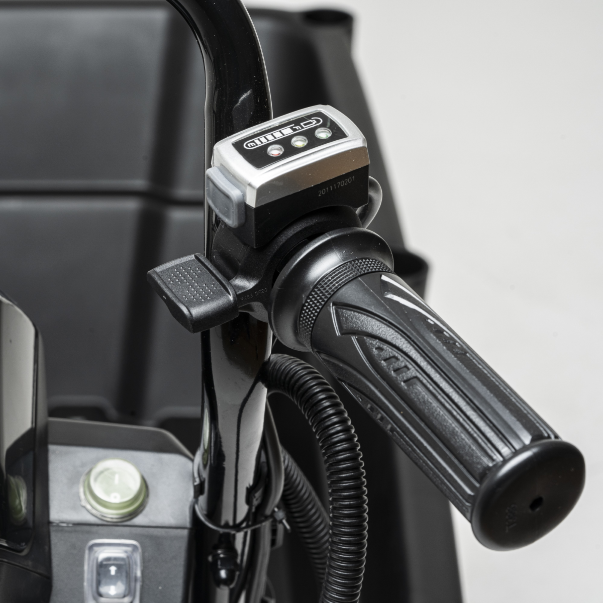 Три скорости: 2 вперед и 1 назад. Максимальная скорость вперед 4,2 км/ч, скорость обратного хода 2,4 км/ч. Для удобной выгрузки предусмотрен подъемный механизм ковша с газовым упором (самосвал). Опорное колесо имеет стояночный тормоз. Время автономной работы до 80 минут от 5 Ач батареи, а максимальная дистанция хода до 5 км от 5 Ач батареи. Вес тележки 37 кг.