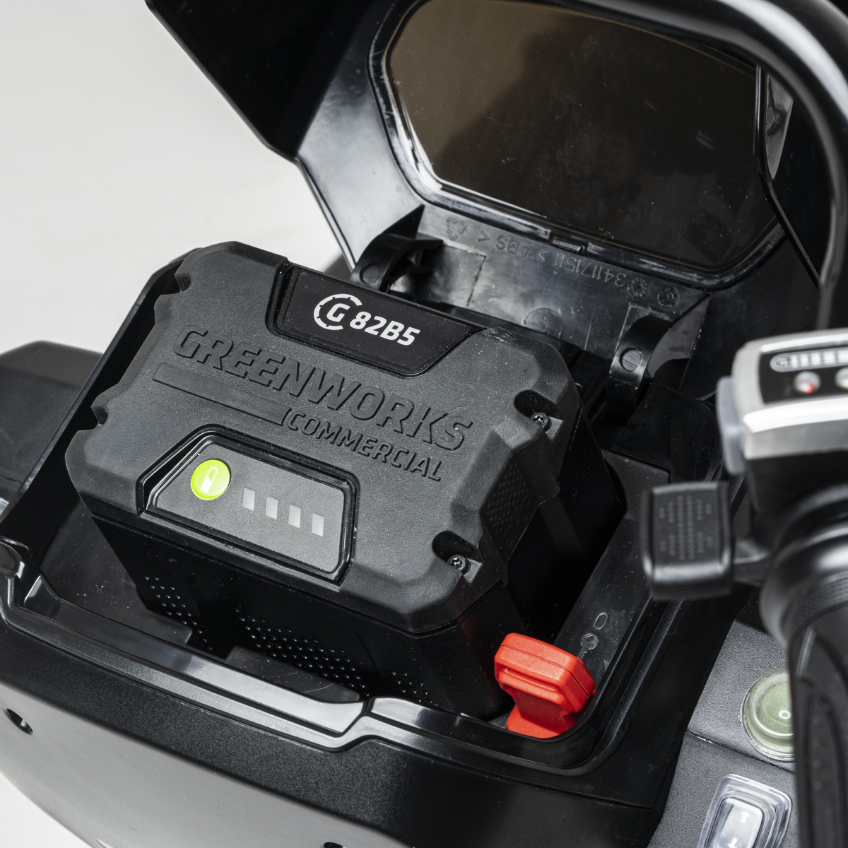 Работа от аккумулятора 82V совместимого с другими устройствами из профессиональной линейки Greenworks Commercial 82V.