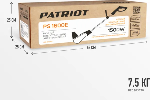 Снегоуборщик электрический PATRIOT PS 1600 E, ручной, колесный движитель, электрический двигатель, мощность: 1500 Вт / 2.01 л.с, захват 35x15 см, выброс на 10 м