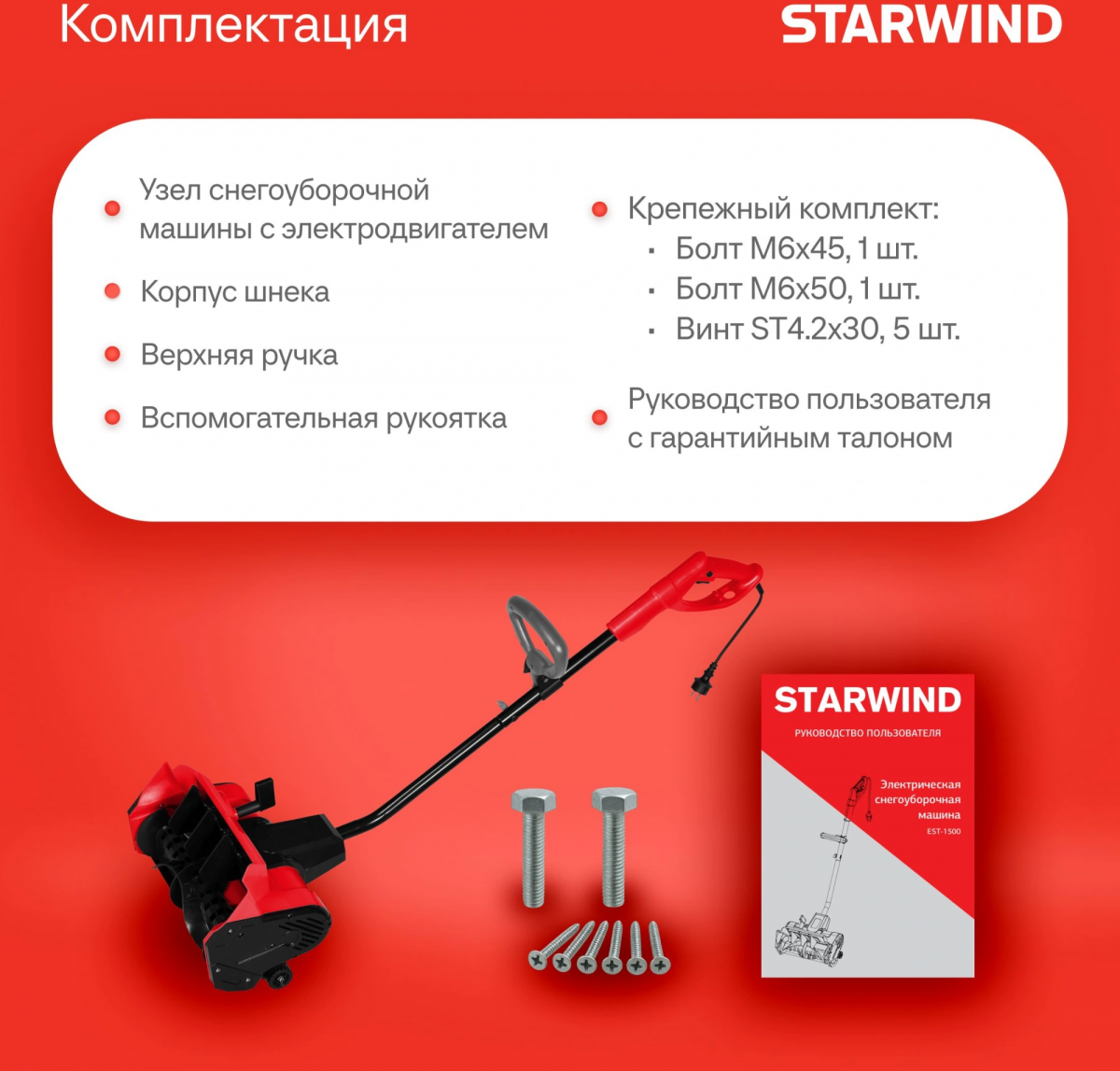 Снегоуборщик электрический Starwind EST-1500, колесный движитель, электрический двигатель, мощность: 1500 Вт, захват 40x15 см, выброс на 9 м