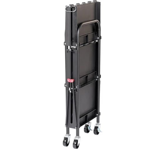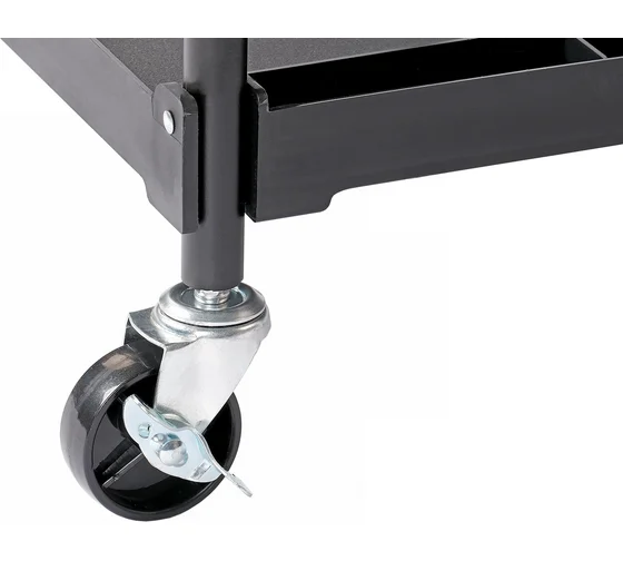 Тележка инструментальная с 3 пластиковыми полками, складная. Тележка инструментальная предназначена для удобства временного хранения и перемещения небольших деталей и инструмента, а также организации передвижного рабочего места в процессе работ. Особая конструкция из металлических стоек и пластиковых полок позволяет организовать комфортное рабочее пространство и предохраняет от случайных царапин на кузове автомобиля в процессе работ.Наличие 3 полок с 5 отделениями обеспечивает достаточное пространство для удобной организации рабочего места и упорядочение хранения инвентаря. Каждая полка в передвижной тележке T14 изготовлена с защитными бортами. Покрытие полок имеет антискользящую поверхность, препятствующую скольжению рабочего инструмента.Максимальная нагрузка на полку составляет 15 кг, общая допустимая нагрузка на тележку — 45 кг.Инструментальная ярусная тележка T14 оснащена маневренными колесами с прорезиненным покрытием для быстрого и легкого перемещения по рабочей площадке. Все колеса вращаются на 360 градусов, что облегчает передвижение тележки. Для безопасности и удобства эксплуатации инструментальная тележка оснащена двумя колесами с тормозом. В комплекте с тележкой поставляются колеса диаметром 70 мм.Инструментальная тележка T14 отличается простотой сборки и легкой конструкцией.
