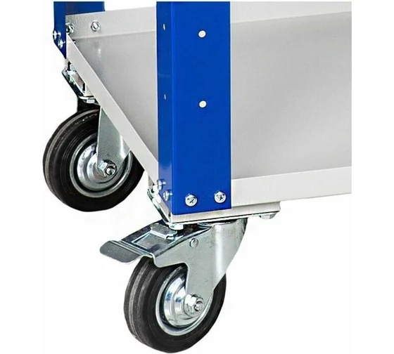 - комплектуются удобной ручкой и резиновыми колесами (диаметр 100 мм), 2 — неповоротных, 1 — поворотное, 1 — поворотное с тормозом;