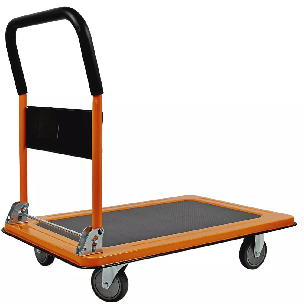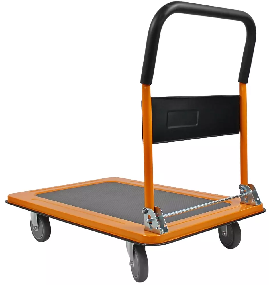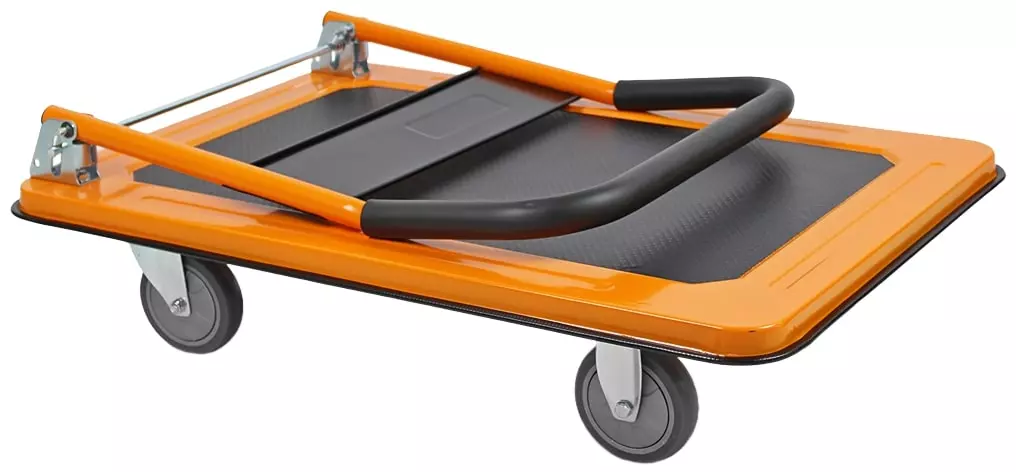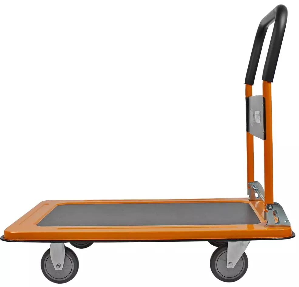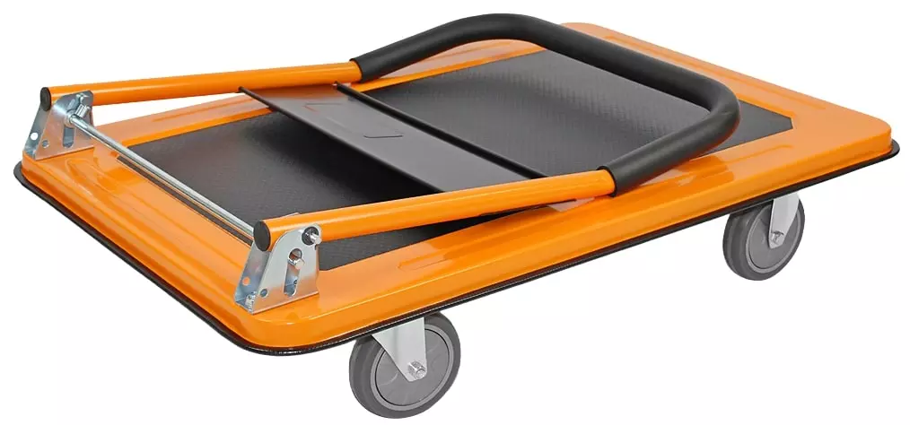 Платформенная тележка ТП 300 служит для транспортировки различных грузов суммарной массой до 300 кг. Отсутствие бортиков позволяет перевозить неформатные грузы. Тележка обладает сплошной металлической платформой толщиной 1 мм, четырьмя колесами (два поворотных) и складной ручкой.