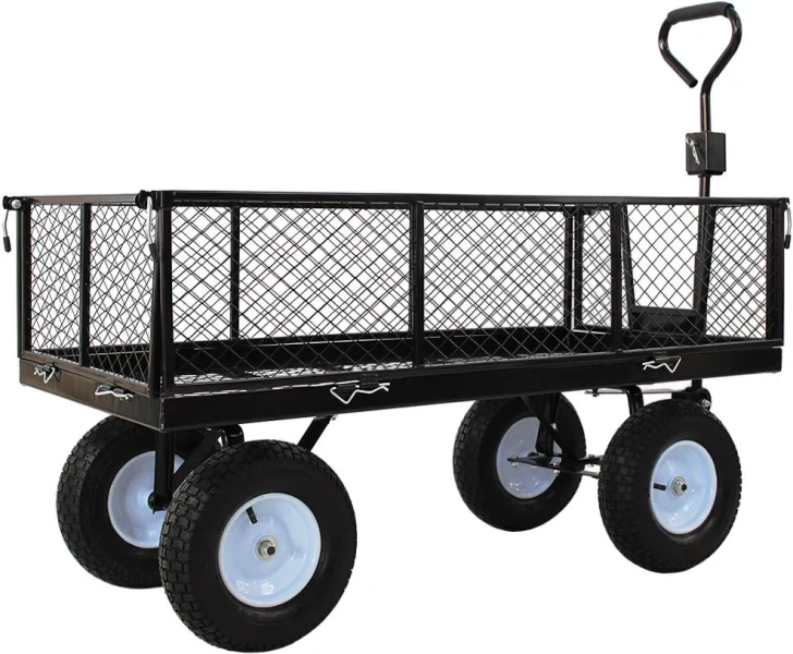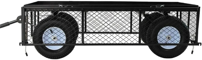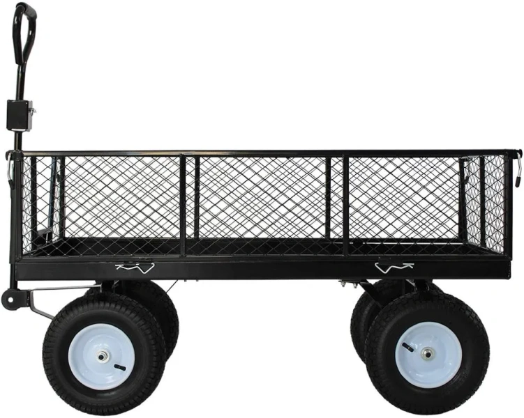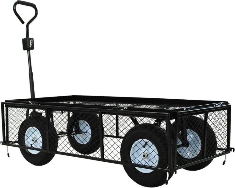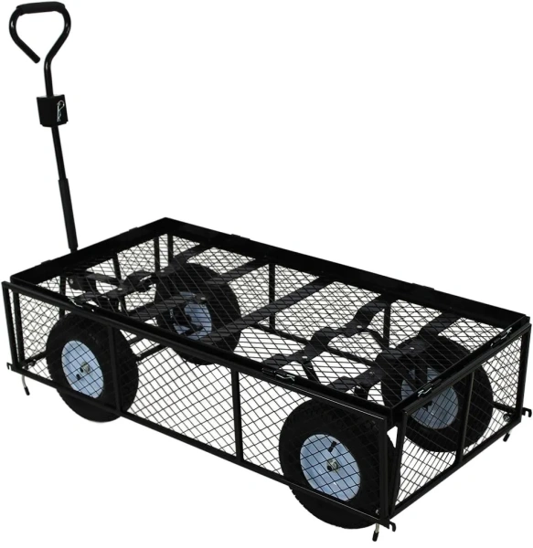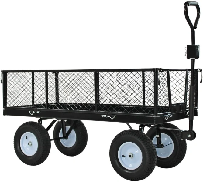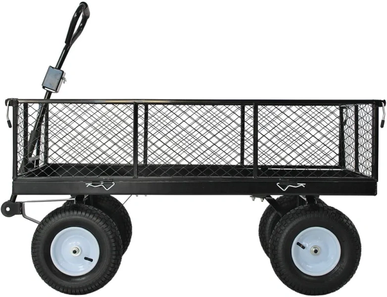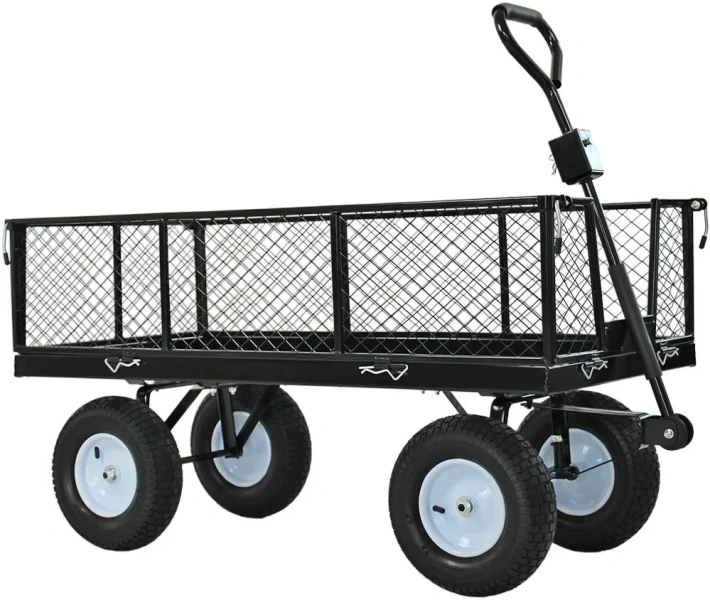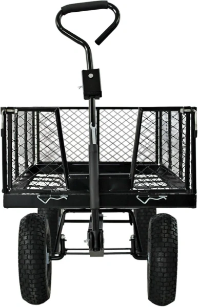 Тележка четырехколесная предназначена для перевозки грузов на складе или садовом участке. Рама и борта тележки изготовлены из цельносварной стальной трубы. Борта откидываются. Комплектуется пневматическими колесами на металлическом ободе.