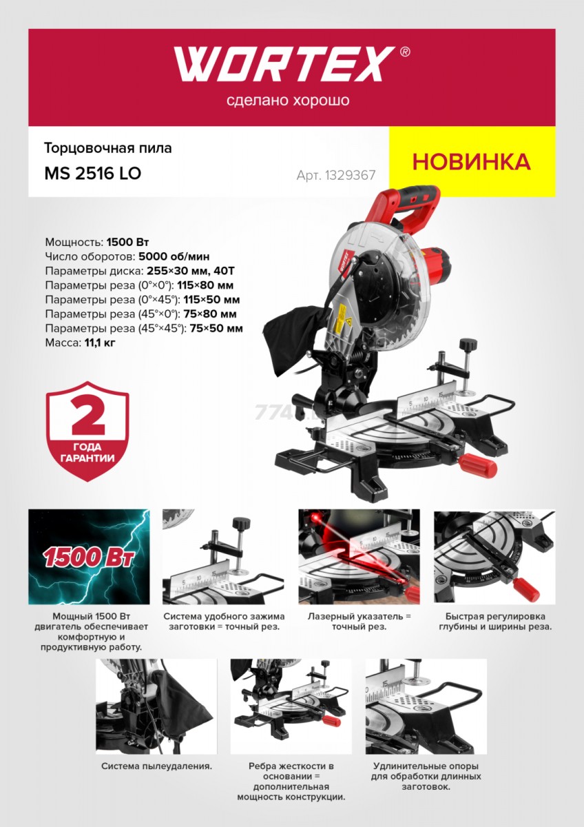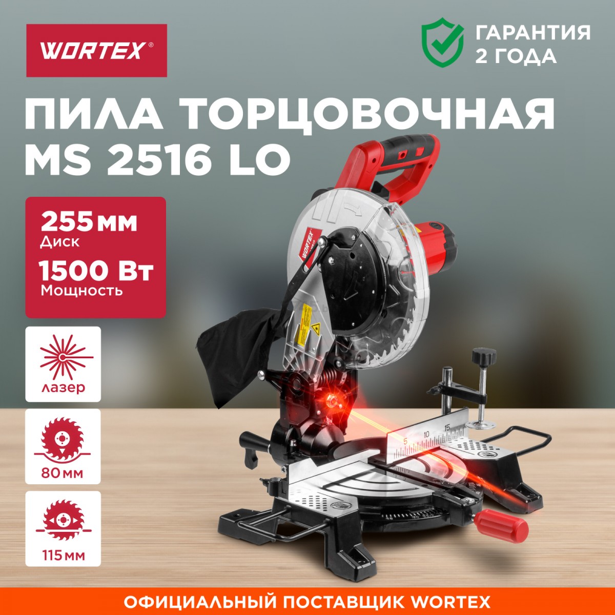 Торцовочная пила WORTEX MS 2516 LO (1500 Вт, 255х30 мм, глубина до 80 мм, ширина до 115 мм, лазер)