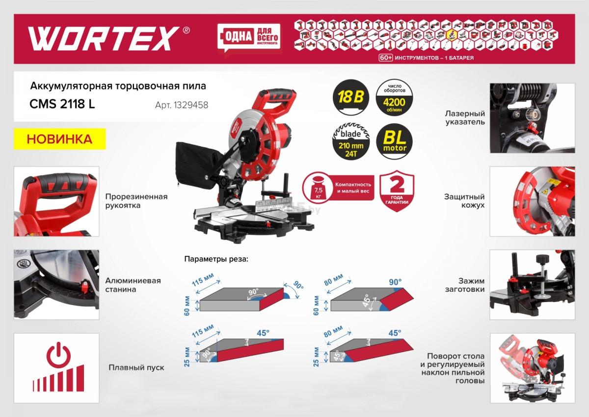 Пила торцовочная аккумуляторная Wortex СMS 2118 L XLT SOLO сочетает в себе оптимальный набор функций для удобной и быстрой работы. Имеется система пылеудаления, лазерный указатель для более точного реза, система удобного зажима заготовки и точный рез. Способна быстро регулировать глубину и ширину реза. Мощный бесщеточный двигатель обеспечивает комфортную и продуктивную работу. Также обладает блокировкой от случайного включения, имеет прорезиненную рукоятку, плавный пуск, а также защиту от перегрева и перегрузки.