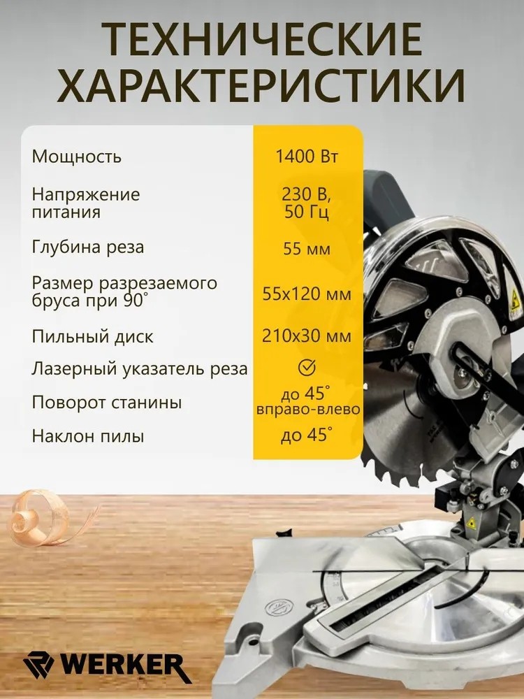 Торцовочная пила Werker EWMS 003, мощность: 1400 Вт, диаметр диска: 210 мм, глубина реза (90°): 55 мм, лазерный маркер, длина: 480 мм, ширина: 300 мм, высота: 300 мм