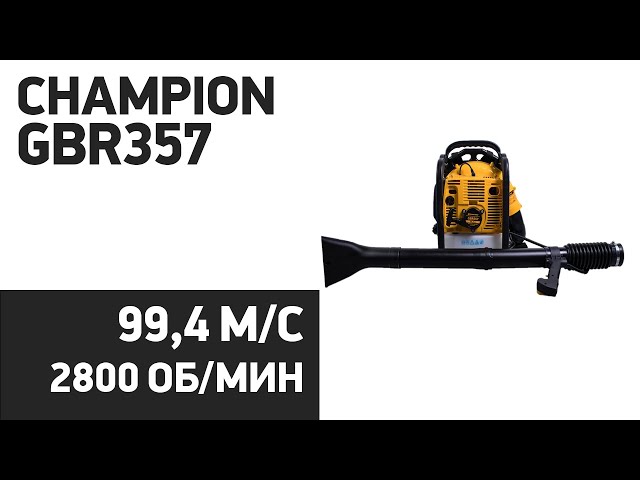 Садовая бензиновая воздуходувка Champion GBR357 ранцевая, мощность 3.4 л.с., объем двигателя 56.5 см3, скорость выдувания 99.4 м/с, производительность 18 м3/мин, вес 9.2 кг.
